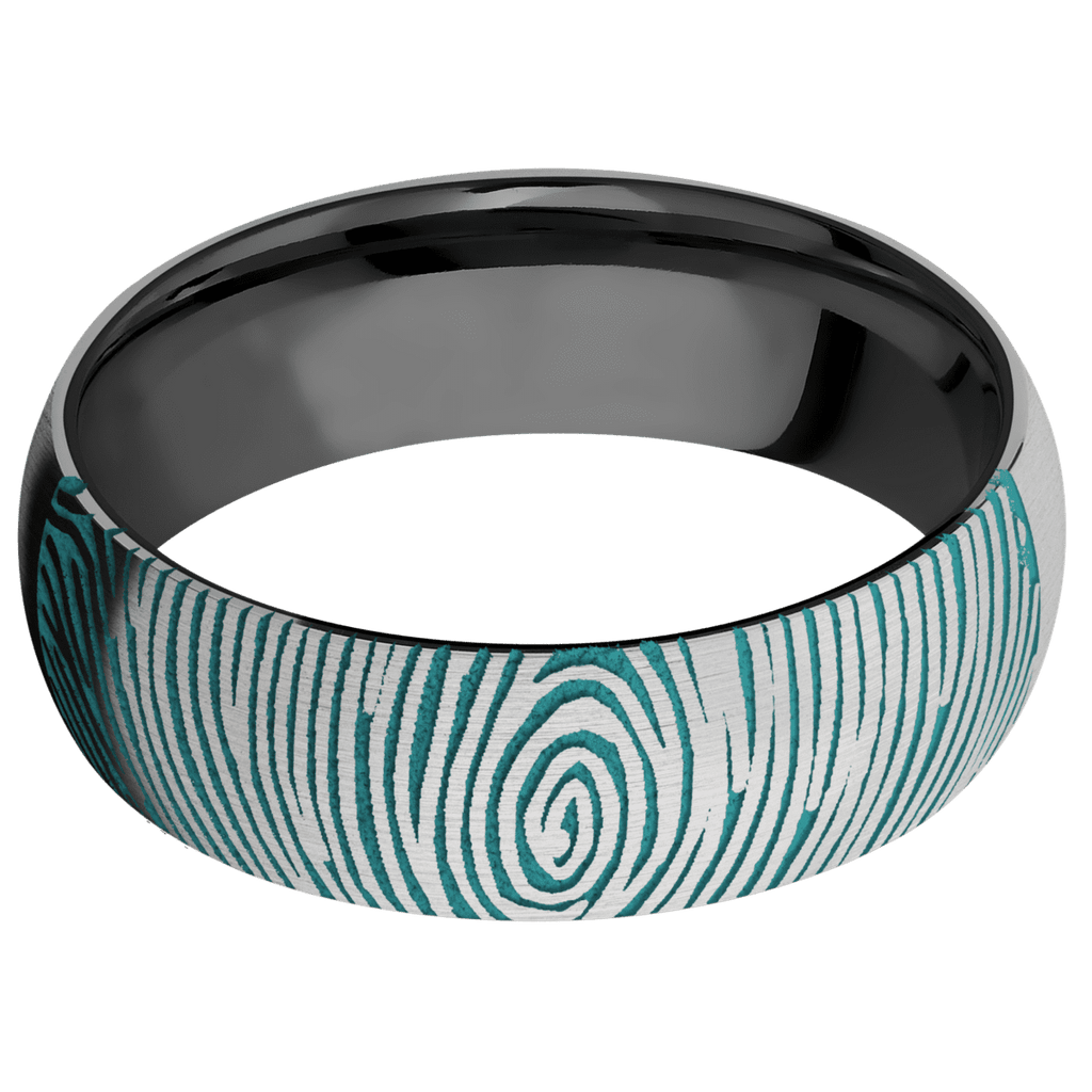 7 mm wide/Domed/14K White Gold band with a laser carved Fingerprint 2 pattern also featuring a Zirconium sleeve.