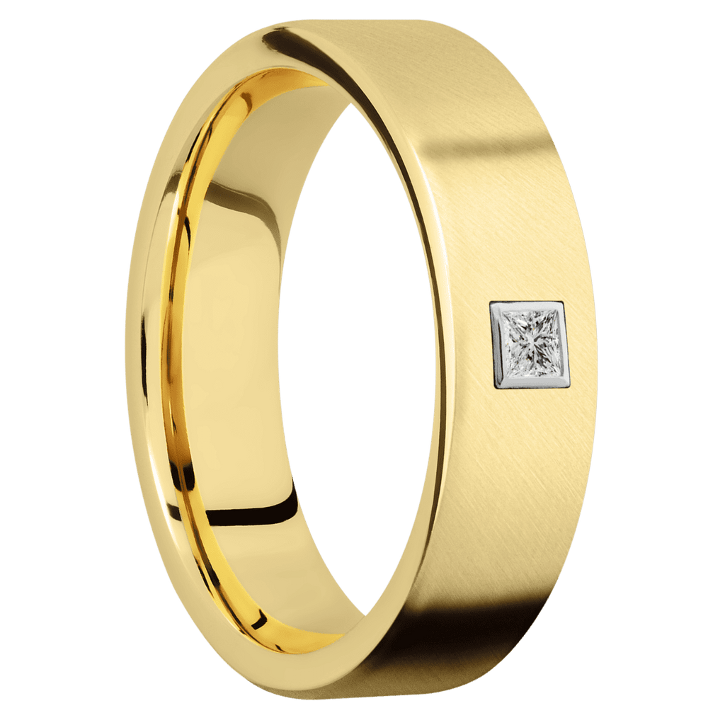 6 mm wide/Flat/14K Yellow Gold band with an arrangement of 1, .1 carat Princess Diamond stones in a Bezel setting.