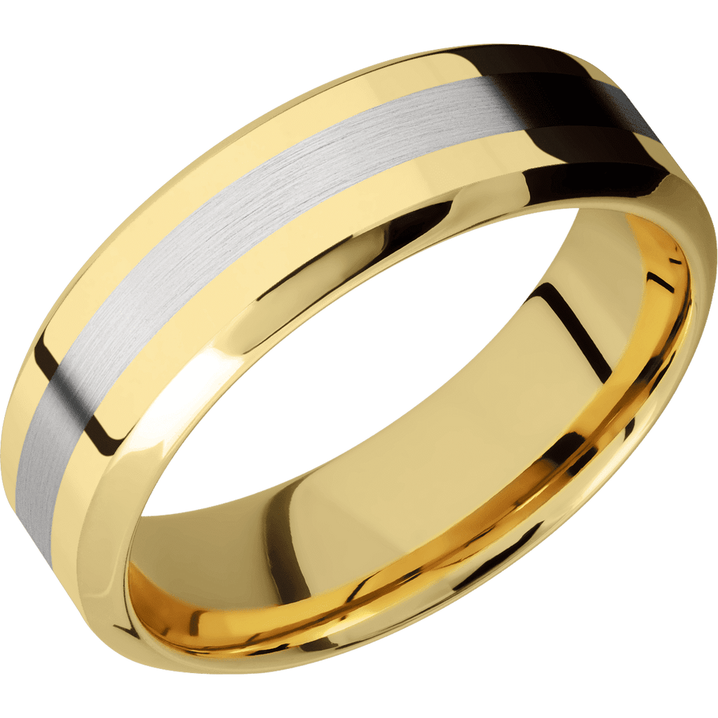 7 mm wide/High Bevel/14K Yellow Gold band with one 2 mm Centered inlay of Palladium Silver.