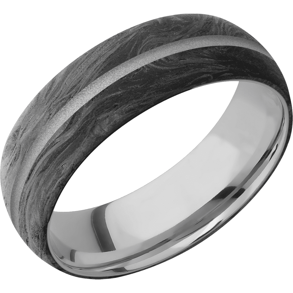 7 mm wide/Domed/Forged Carbon Fiber band with one 1 mm Centered inlay of Crushed Silver also featuring a Titanium sleeve.