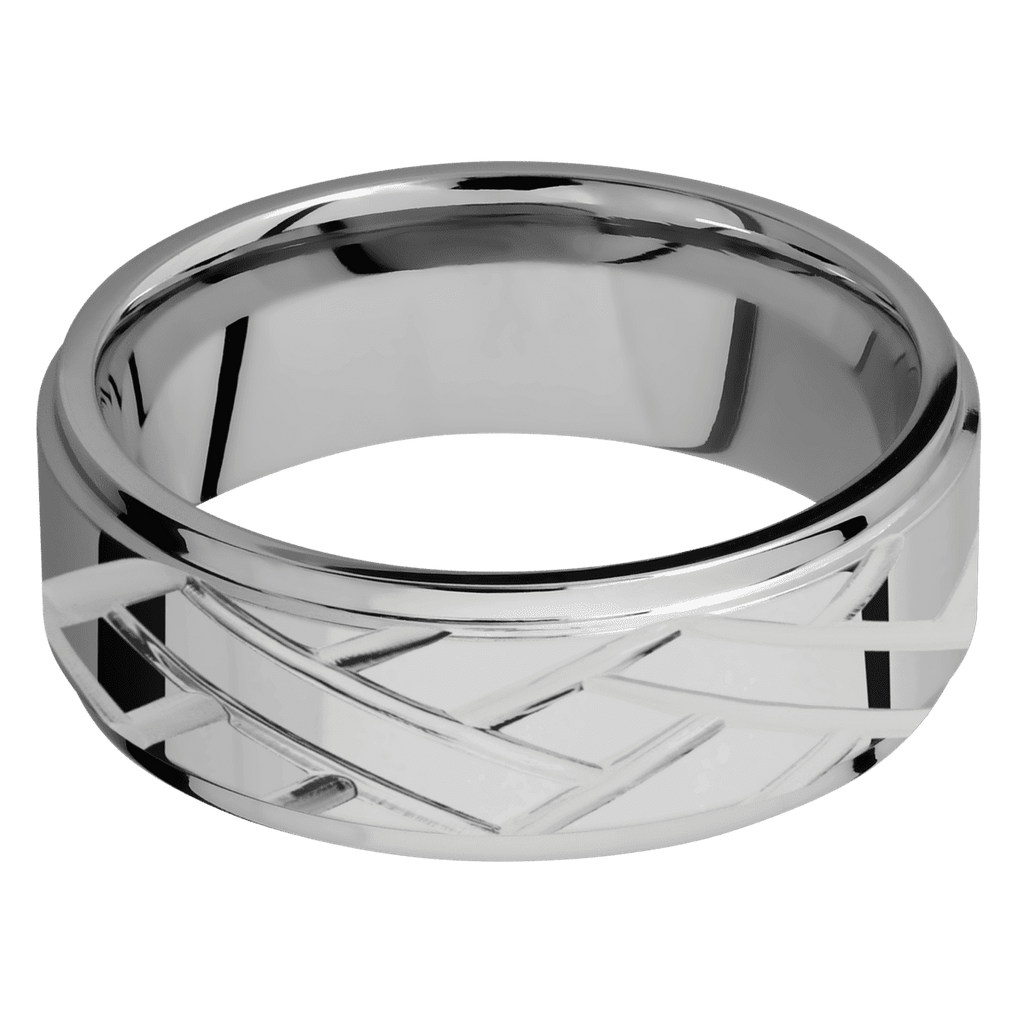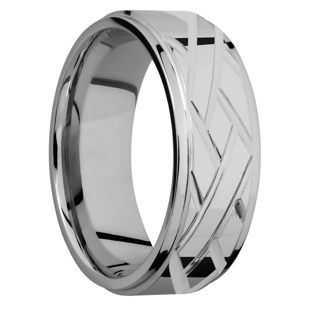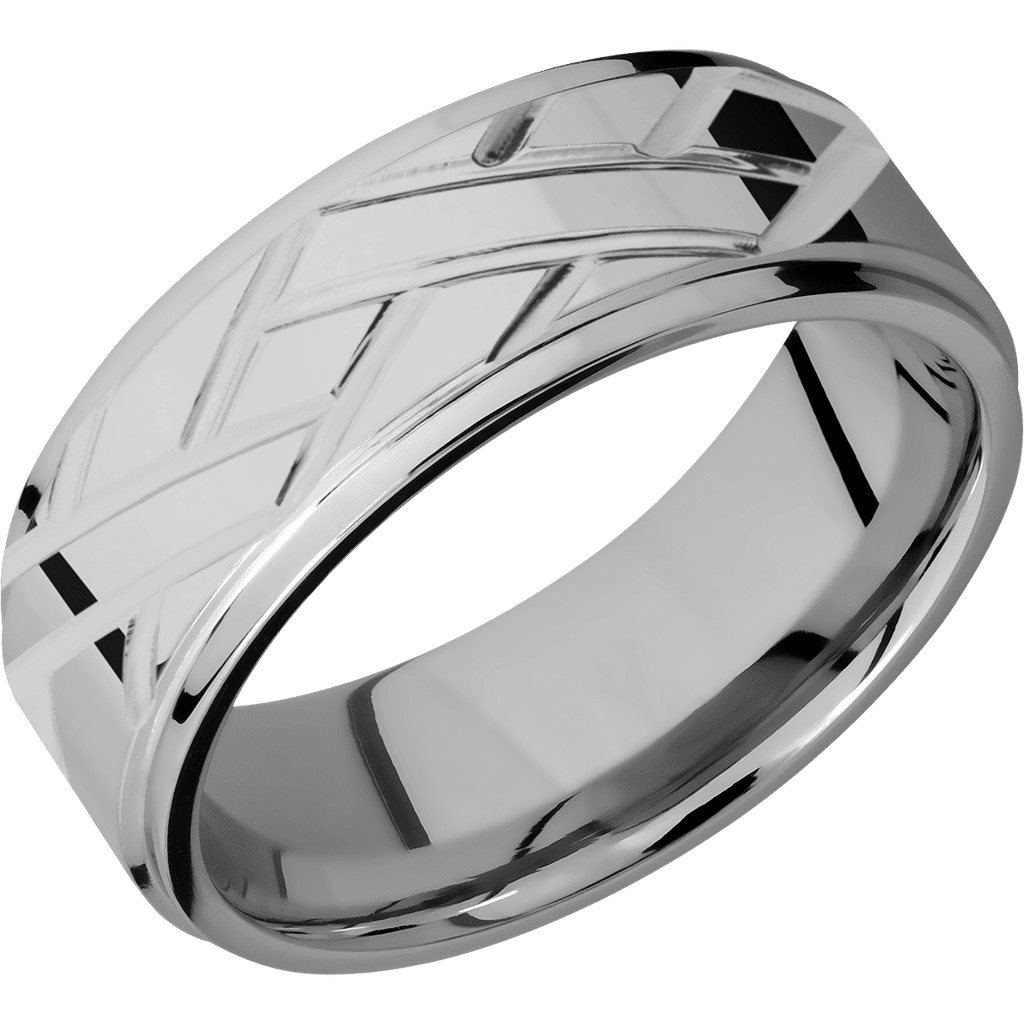 8 mm wide/Flat Grooved Edges/Titanium band with a machined Lattice pattern.